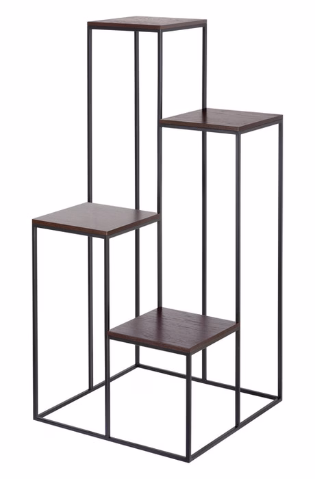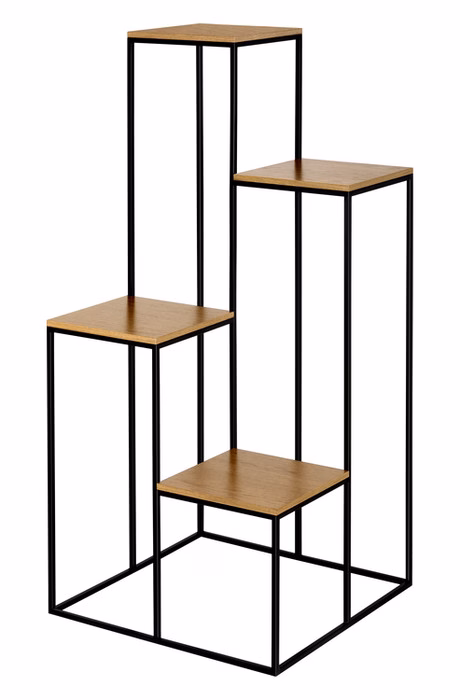 Interior decorations / Plant stands / Forged plant stands – large - 4-tier flower stand. Metal flower stand The 4-big stand is an expanded, enlarged version of the universal stand. It is made up of four elements which, when joined together, form a solid structure that in itself is an original decoration and a useful element of interior design. The stand has a metal base and a top finished in natural veneer. The panels are easy to keep clean. They provide a strong and durable base even for heavy objects. The stand can be used as a flowerbed, which is ideal for creating original flower arrangements. The stand and overlays are available in several colour variants to suit different interior styles.