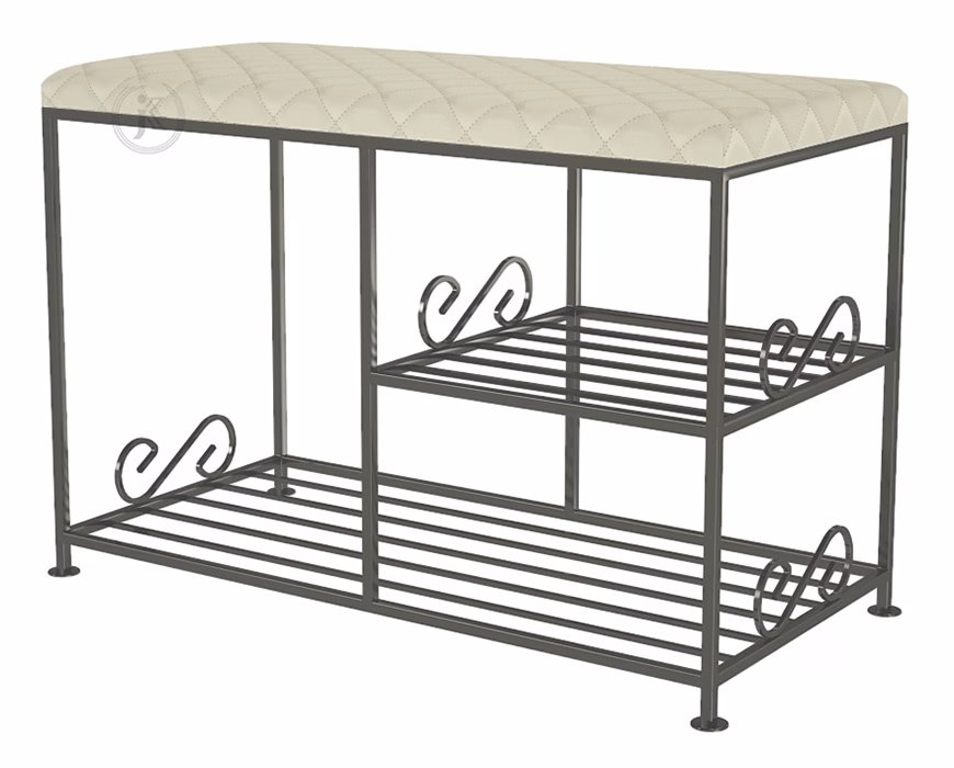 Furniture / Benches and sofas / Shoe benches - Hallway shelf with seat The upholstered pouffe from the Versanis shop's offer is a high quality piece of furniture of Polish production. It is perfect for the hallway, corridor, but also for the bathroom or dining room. It can serve as a comfortable footrest, a handy seat for putting on shoes or a shelf for towels. The stable frame of powder-coated metal is decorated with curved elements and combined with a soft seat upholstered with fabric in a choice of several colour options. The practical double shelves, one of which is smaller and separate from the other, can be used to store shoes and a box of shoe care accessories. The elegant upholstered pouffe will complement a stylised interior, but will also work as an accent in a modern space.