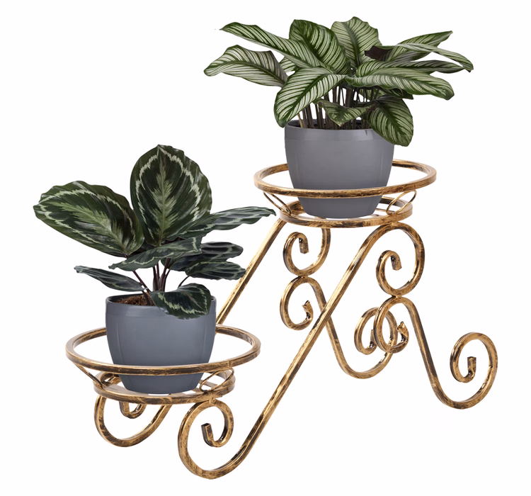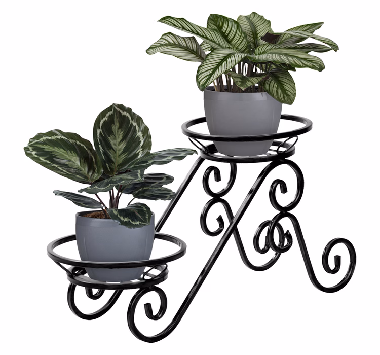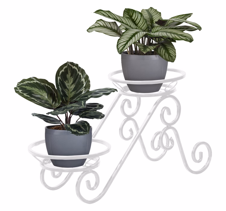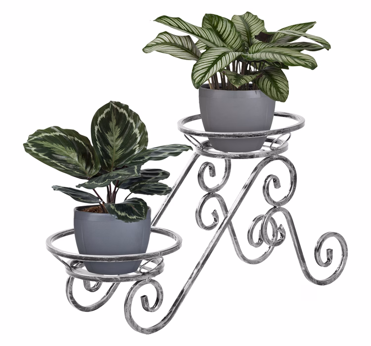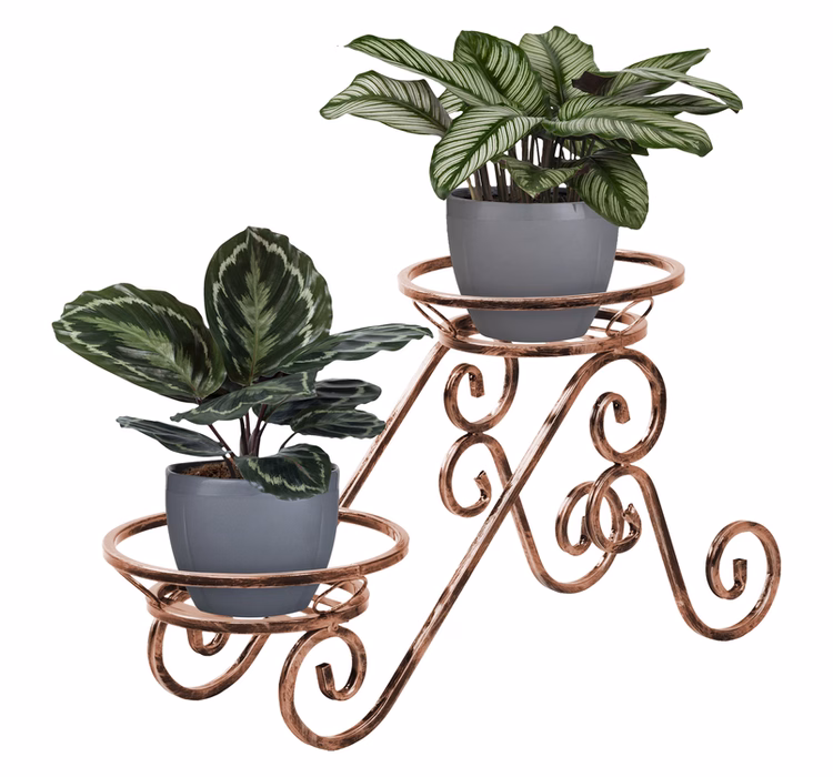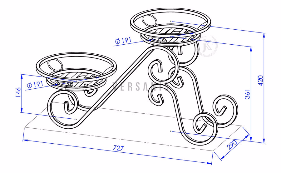 Interior decorations / Plant stands / Flowerbeds - small - Metal flowerbed for 2 plant pots A flowerbed for the terrace or garden from the wide range of products in the Versanis shop impresses with its durability and elegant appearance. It was made using the metalwork technique (which has been fashionable and desirable for years) in the workshop of a Polish manufacturer. This flower pot stand can be placed outside the house or inside, for example in a large living room. It will perfectly complement the arrangement of the surroundings and emphasise its character if we choose one of the several available shades of the metal frame: black, white, chrome, copper. The modern, durable and extremely stable flowerbed with romantic motifs of subtle waves made of steel has two practical bases for flower pots. It has a lightweight construction, so it can be moved anywhere on its own.