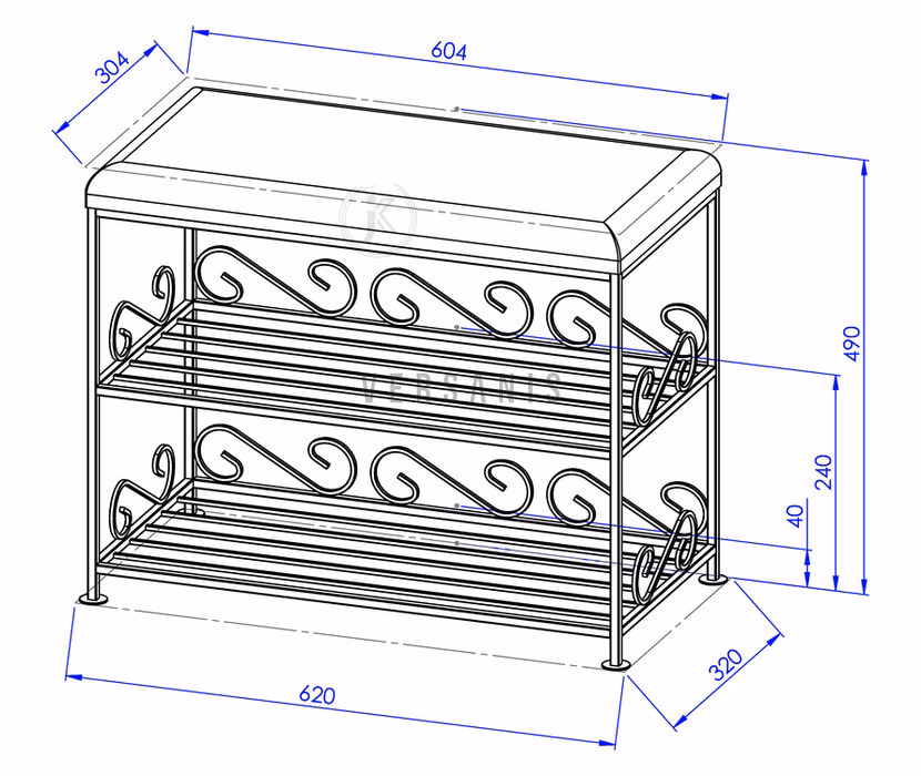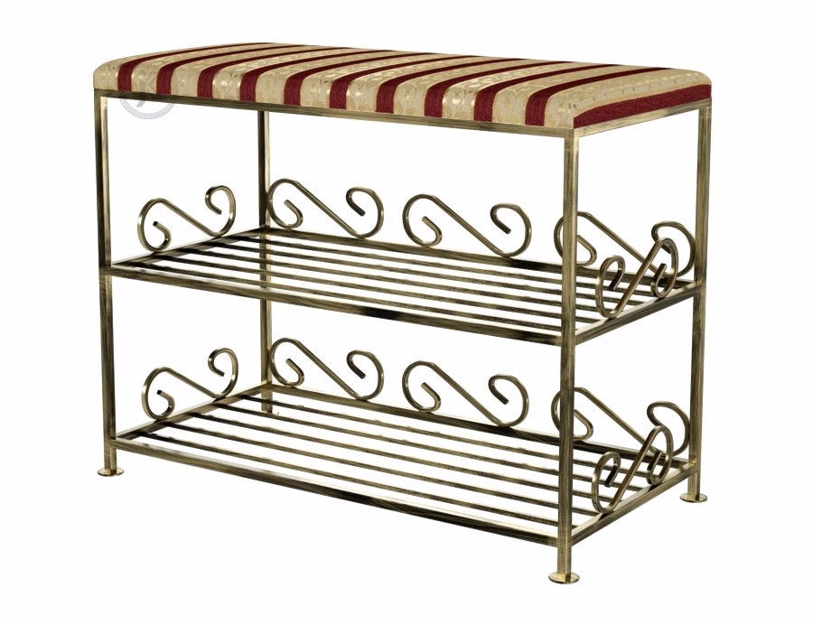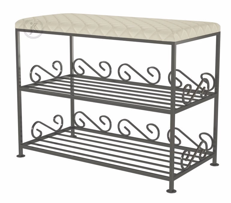 Furniture / Benches and sofas / Shoe benches - Shoe rack with seat The upholstered, elongated shoe shelf with seat is a practical and very elegant solution that both helps to keep things tidy and brings an elegant atmosphere to the interior. Great for narrow corridors and small hallways, it will also look striking as a complement to the design of large living rooms. The sturdy structure made of powder-coated metal is decorated with bent forms and looks extremely chic. The soft, upholstered seat, on the other hand, is upholstered in fabric in one of several fashionable colour options to choose from. Two additional shelves made of sturdy wire will come in handy for storing shoes and accessories. The shoe cupboard with seat from the Versanis online shop can be placed in both classic and modern rooms.