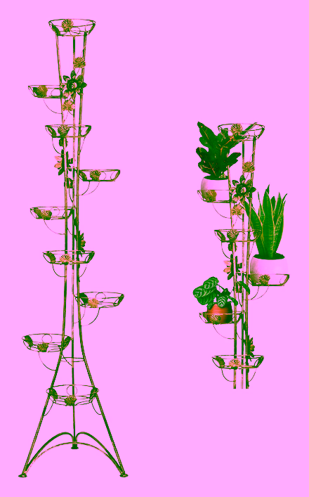 Interior decorations / Plant stands / Forged plant stands – large - Tall Flower Bed Column 9 with rose The tall column flowerbed from the Versanis online shop is a romantic accessory that will create an "Enchanted Garden" atmosphere on your terrace. Decorated with romantic motifs of forged steel flowers, leaves and subtle waves, it looks extremely elegant. The tall stand consists of up to nine pot supports. Despite its height, it is more than stable and durable. For the best effect, it is advisable to plant hanging plants in the pots, which will beautifully cascade down from the top, pleasing the eye of guests and householders. To make it fit in more with its surroundings, you can choose from several colour options.