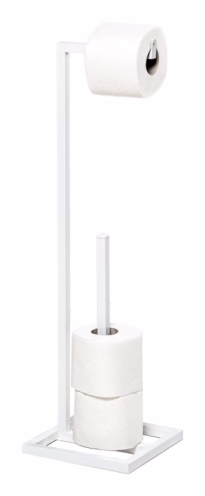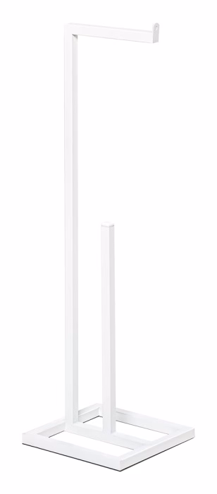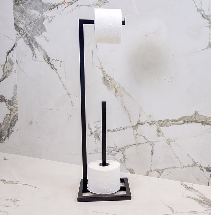 Interiors / Bathroom / Paper racks - Toilet paper rack Made with the utmost care Covered with a lacquer coating resistant to corrosion and scratches Available in black structure and white Storage space for up to 4 rolls Roll anti-slip element Feet to prevent shifting and scratching of the floor Shipped complete, no self-assembly required. Free-standing toilet paper holder + holder for spare rolls Presenting a toilet paper stand that will blend in perfectly with the style of your bathroom. Thanks to its simple design and visually light form, it will not dominate the room but will provide functional storage for toilet paper. The stand is made of 1.5x1.5 mm metal profile. It has been powder-coated with fine-textured black paint. Such a protected coating will ideally protect the stand from corrosion. The stock space is capable of holding up to 4 rolls of paper. The holder's design is equipped with four gel feet, which will prevent the structure from moving and protect the floor from scratches.