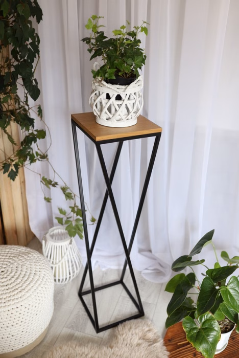 Interior decorations / Stands / Multifunctional stands - Flowerbed, diagonal plant stand with top Choose a brand that knows the needs of its customers and creates excellent solutions combining quality, practicality and beauty. Kapelańczyk is a manufacturer that focuses on products for the home and garden. We can confirm that they are excellent in every respect and can very well fill a given space with the best possible solutions. Diagonal stand - excellent workmanship The presented mini version of the diagonal stand is an extremely interesting piece of furniture, which is worth using in your particular space. The metal, black construction looks really interesting, and the wooden top in two colour versions finishes this piece of furniture in a beautiful way. Use in modern spaces This model will work especially well in spaces decorated in a modern, designer style. It will be an interesting option in the living room to place a flower pot on it, arrange a bedside lamp on it, use it in a study, waiting room or office. We are convinced that anyone who chooses this particular choice will certainly be able to use the potential of the Kapelańczyk furniture in an original way. For those who appreciate such a style, we fully encourage you to pay attention to furniture from the same category, which together will be able to create a complete and coherent whole.